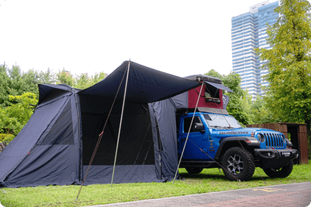 The fully open design, featuring two windows and two doors on either side, allows for unobstructed views and a cool breeze to flow inside. Enjoying the outdoors and refreshing breezes from inside enhances the camping experience.