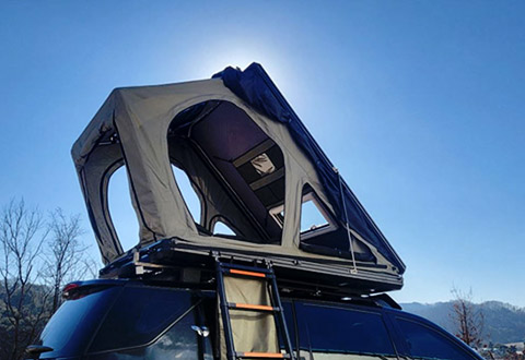 차량 상단에 설치되는 삼각형 하드쉘 텐트는 혼자서도 손쉽게 펼칠 수 있도록 설계되었습니다. 하부에 적용된 필로티 구조는 지면의 진동을 줄여 흔들림 없이 안정적인 사용이 가능합니다./p>